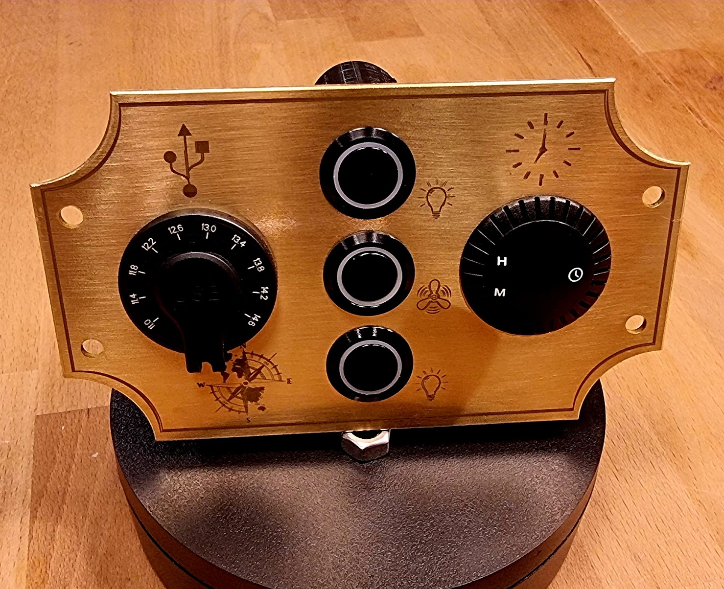 In den letzten Wochen sind mehrere, unterschiedliche Designs von Schalttafeln aus Messing entstanden. Material ist 3mm Messing mit Zapon Lack versiegelter Oberfläche, gelaserten Symbolen und gefasten Kanten. Es können unterschiedliche Größen und Varianten erstellt werden.